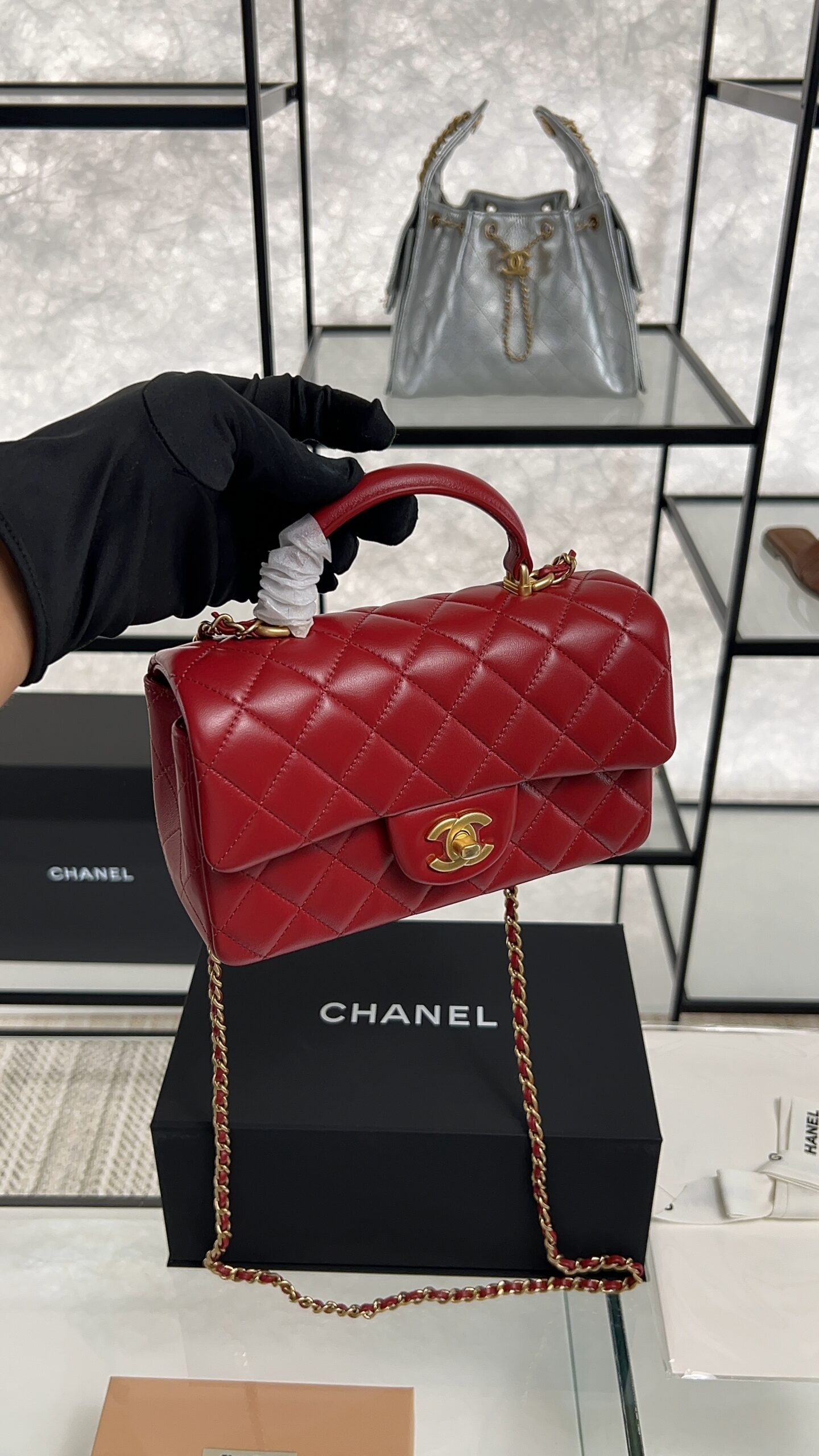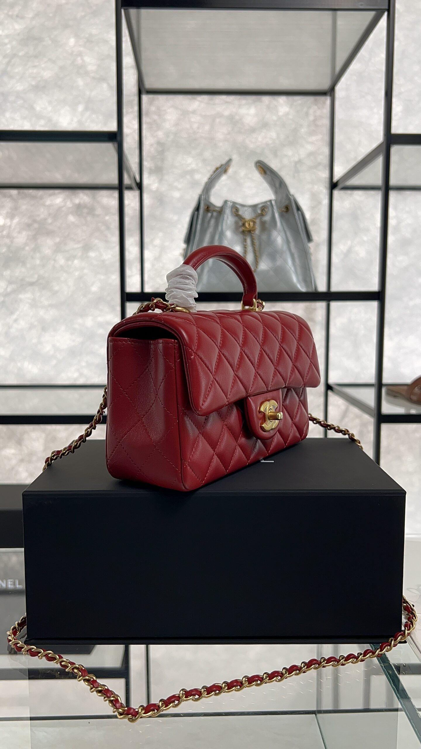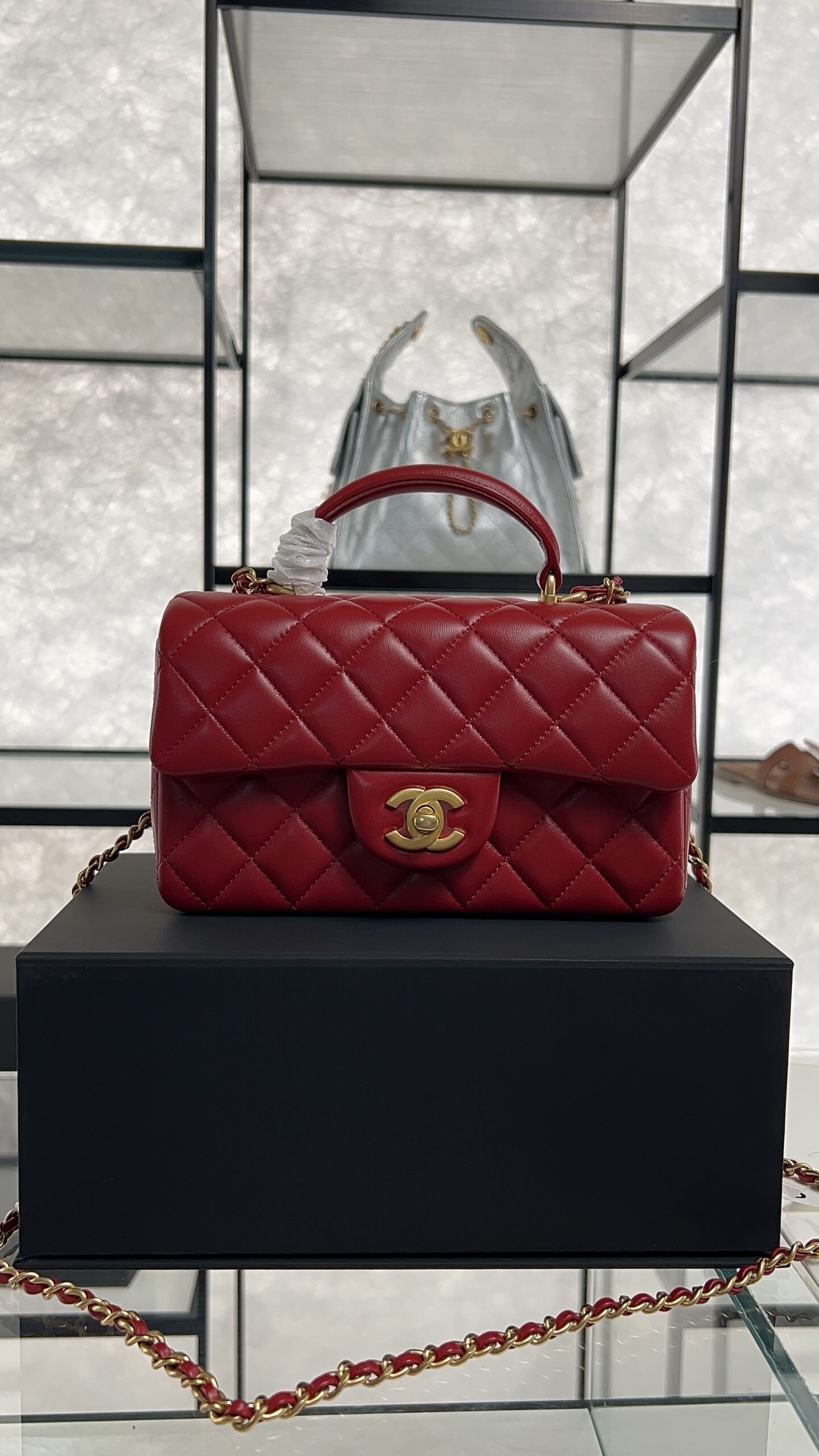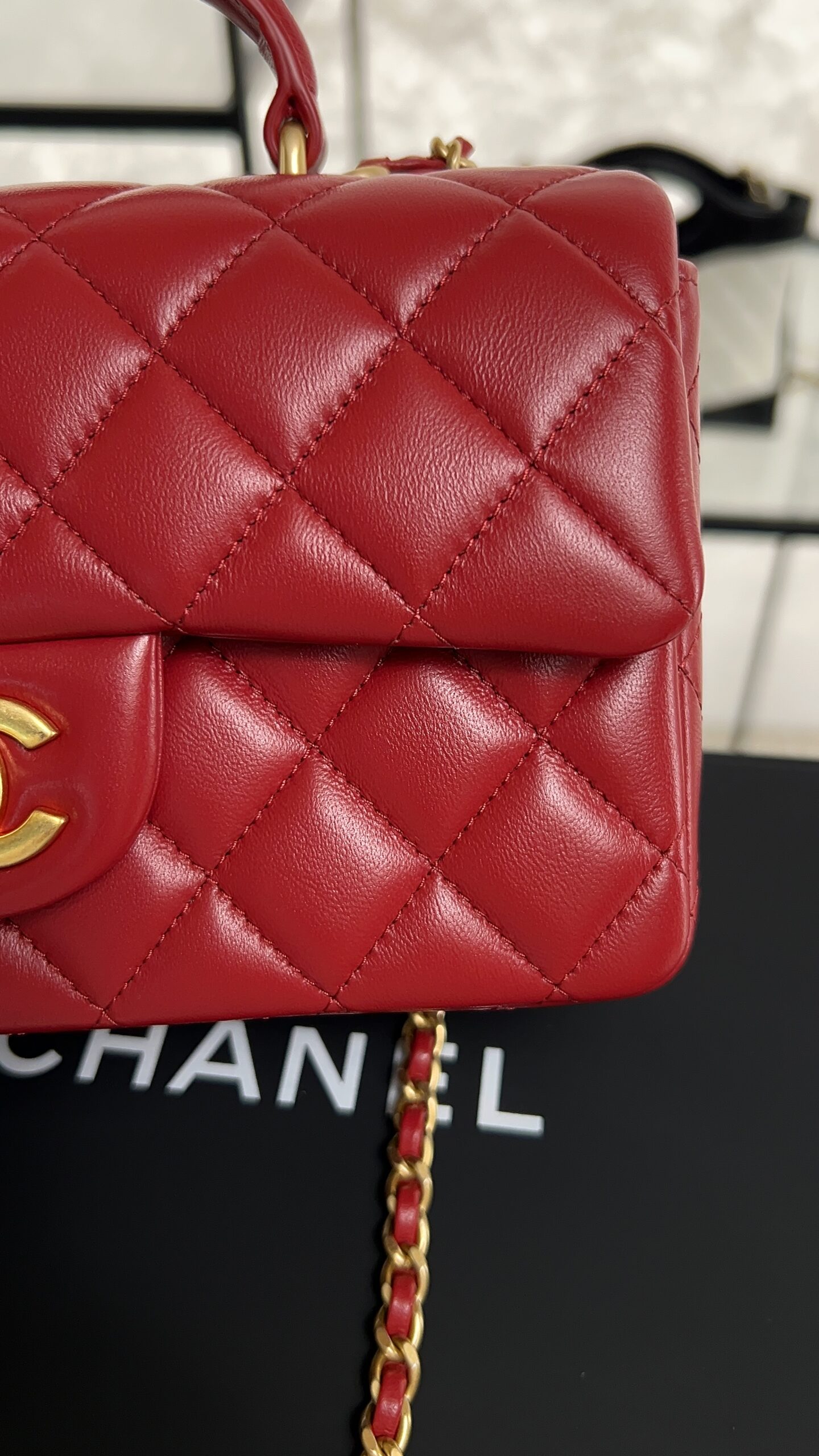 Be the first to review “Chanel Lambskin Quilted Mini Top Handle Rectangular Flap Rose”